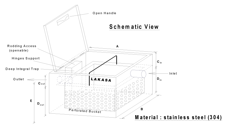 LAKASA Sediment Interceptor is completed with a perforated bucket and able to act as an effective strainer to avoid drain lines clogging by foreign solid particles. The perforated bucket should be cleaned on daily basis or as frequent as possible to avoid overflow of solid waste and interrupting free flow of wastewater in the drain lines.